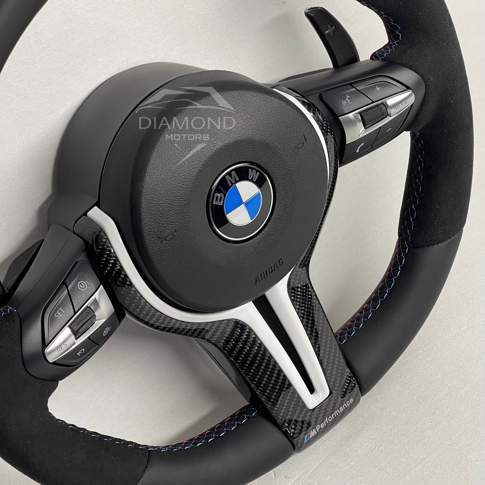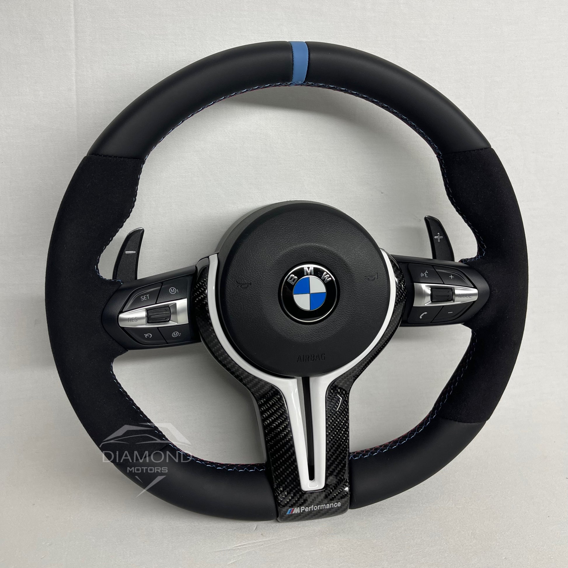 Offrez à votre véhicule un style unique avec ce volant personnalisé en cuir semi-alcantara et inserts en carbone brillant. Conçu avec des surpiqûres aux couleurs M et un rappel bleu et blanc, il apporte une touche sportive et élégante à votre véhicule.